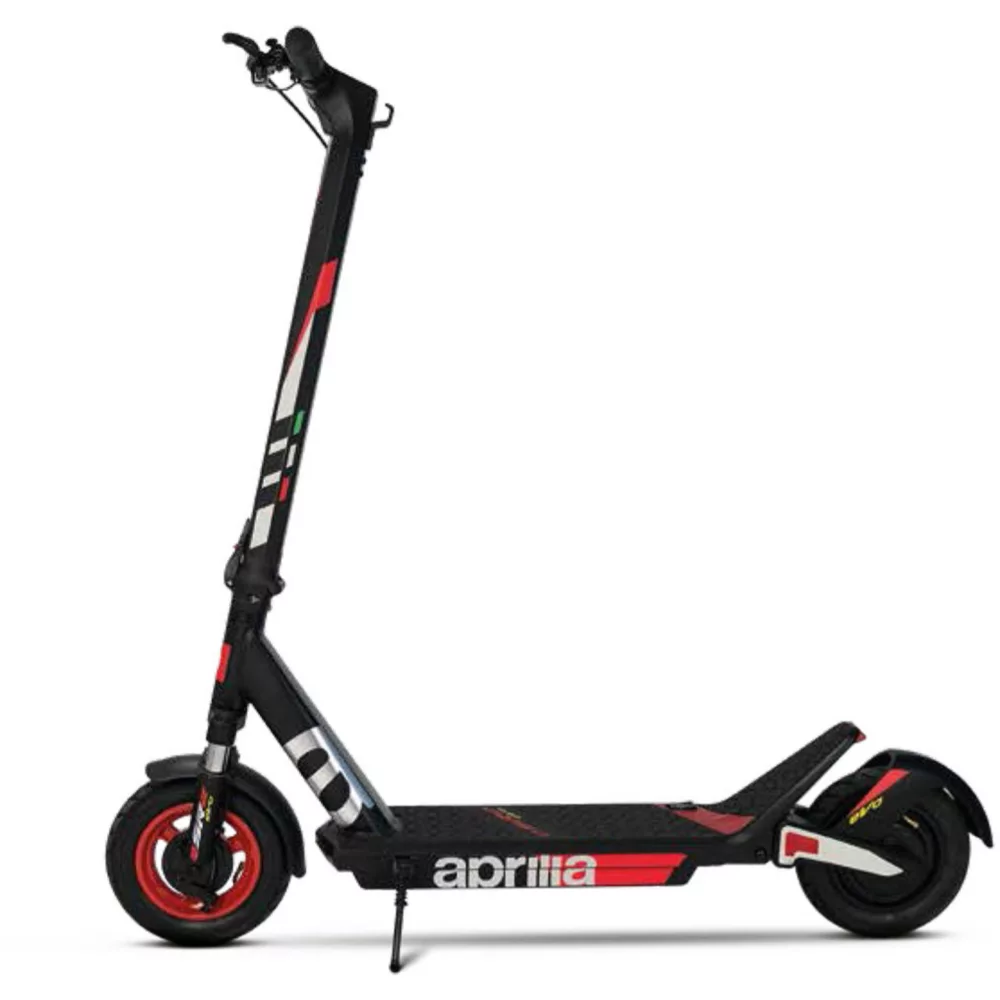 Montée sur des roues de 10 pouces, la trottinette électrique de Aprilia pèse 18 kilos avec sa batterie. Elle est équipée de freins Tambour + électronique et autorise une charge maximale de 100 kg .