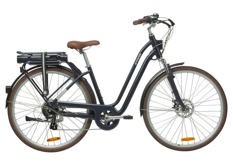 Le Decathlon ELOPS 900 E est un vélo électrique urbain associant un moteur intégré à la roue arrière à une batterie amovible autorisant 40 à 70 km d’autonomie avec une charge.