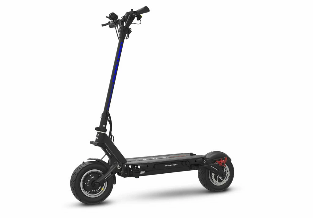 Montée sur des roues de 10 pouces, la trottinette électrique de Dualtron pèse 43 kilos avec sa batterie. Elle est équipée de freins à disque à assistance hydraulique à l’avant et à l’arrière et autorise une charge maximale de 120 kg .